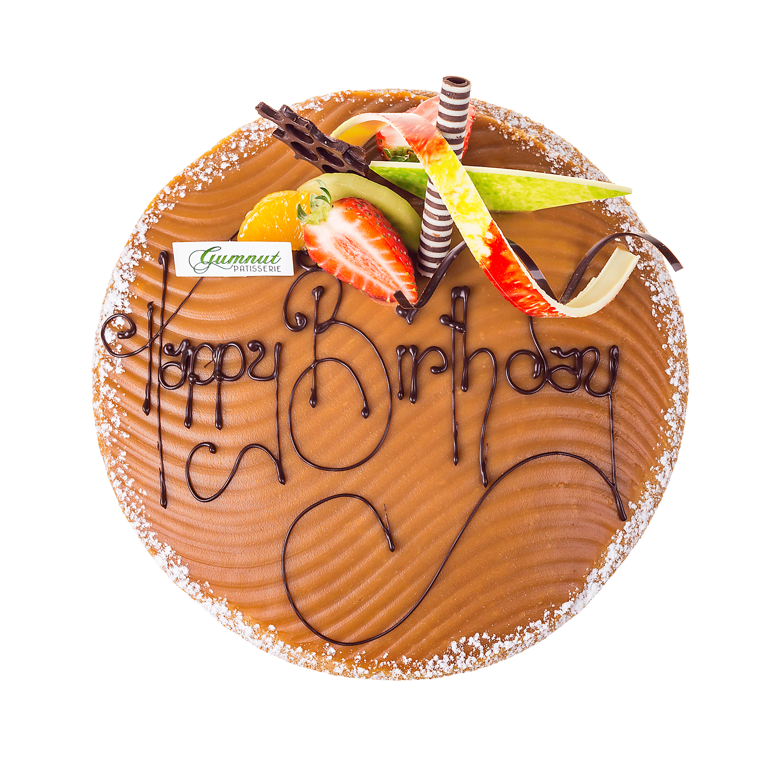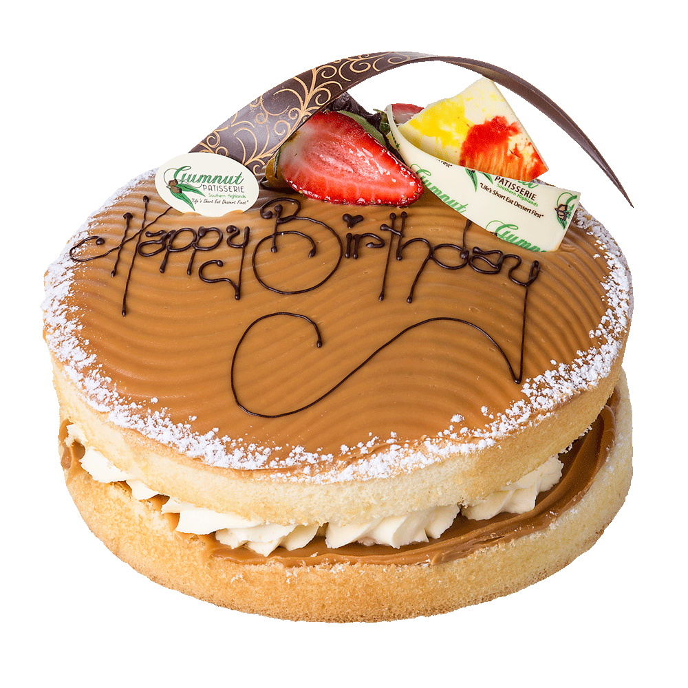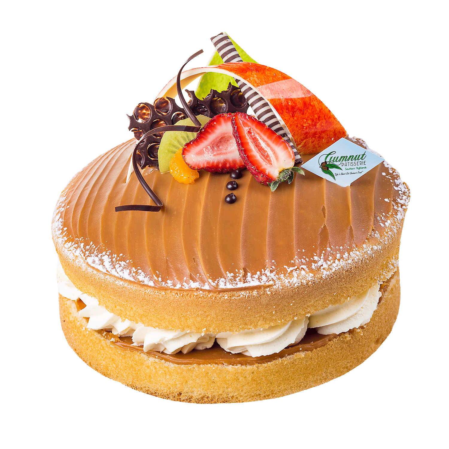 A light and fluffy Vanilla sponge filled with a layer of caramel & fresh cream then topped off with more caramel, fresh fruit and handmade chocolate decorations.