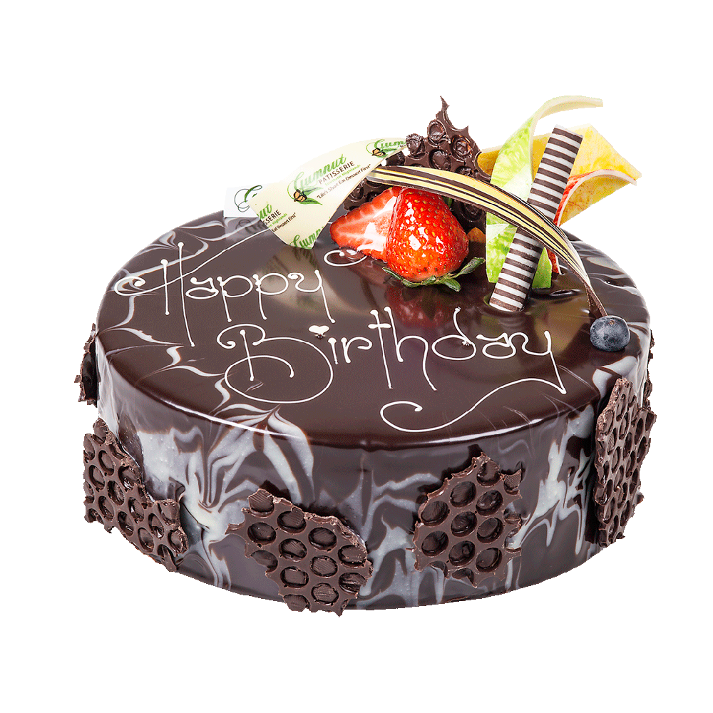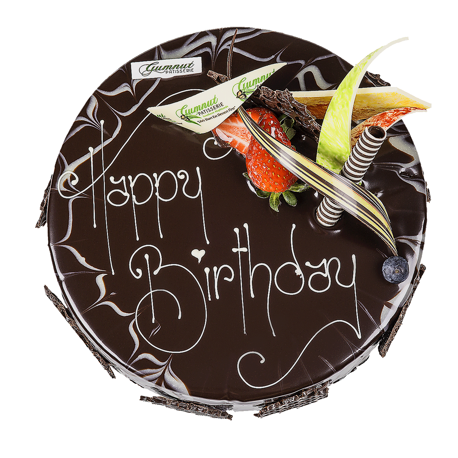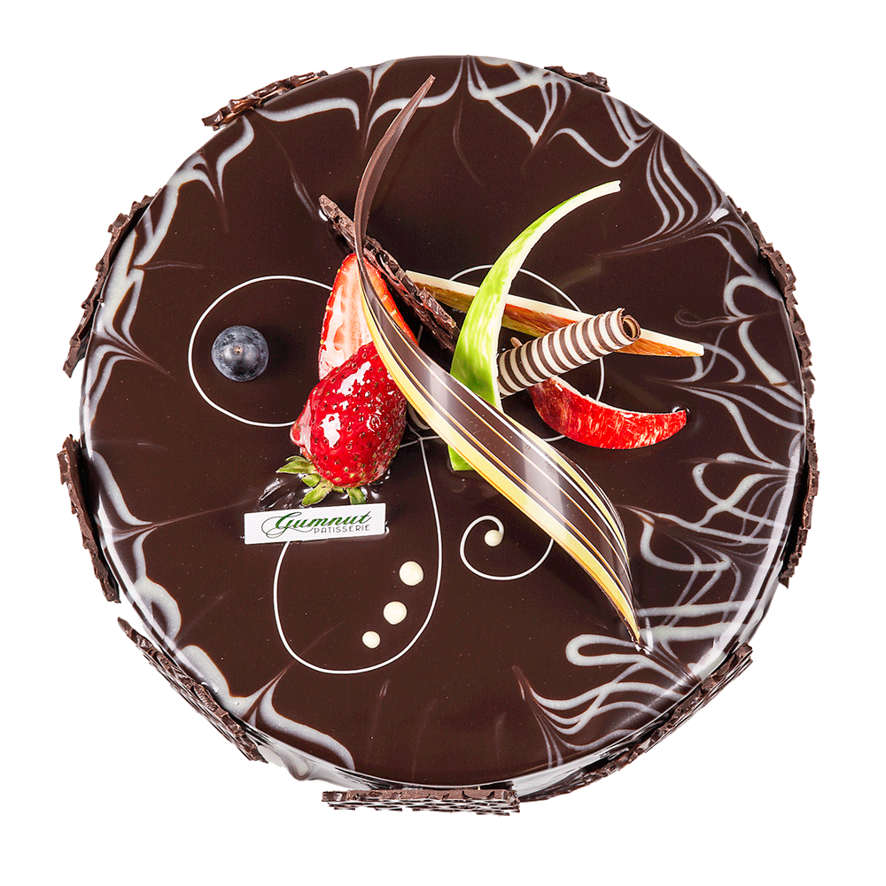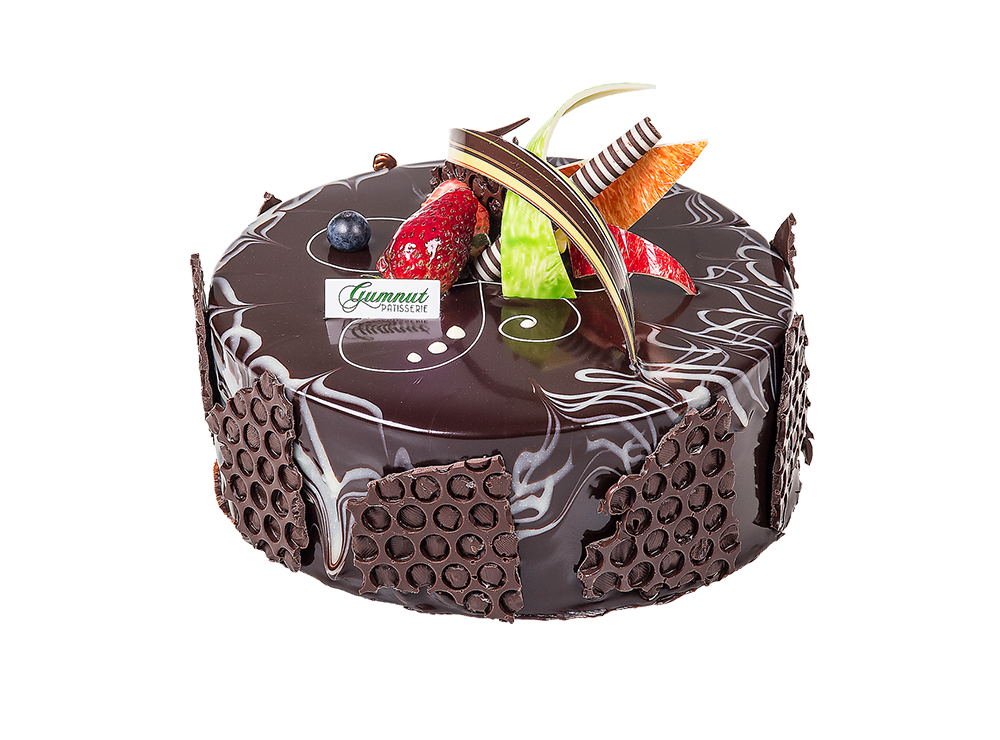 Gumnut’s very own traditional Mud Cake, filled & glazed with our chocolate ganache, finished with a touch of white chocolate ganache. We then garnish with our own handmade chocolate decorations and fresh fruit.