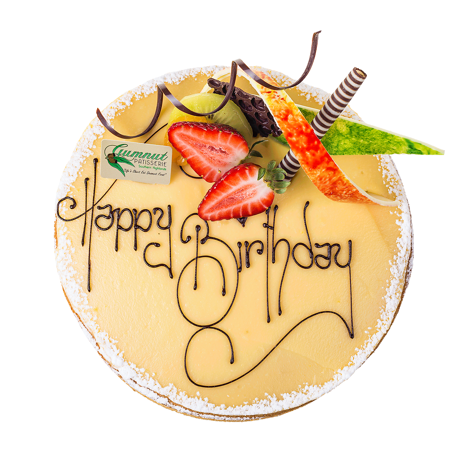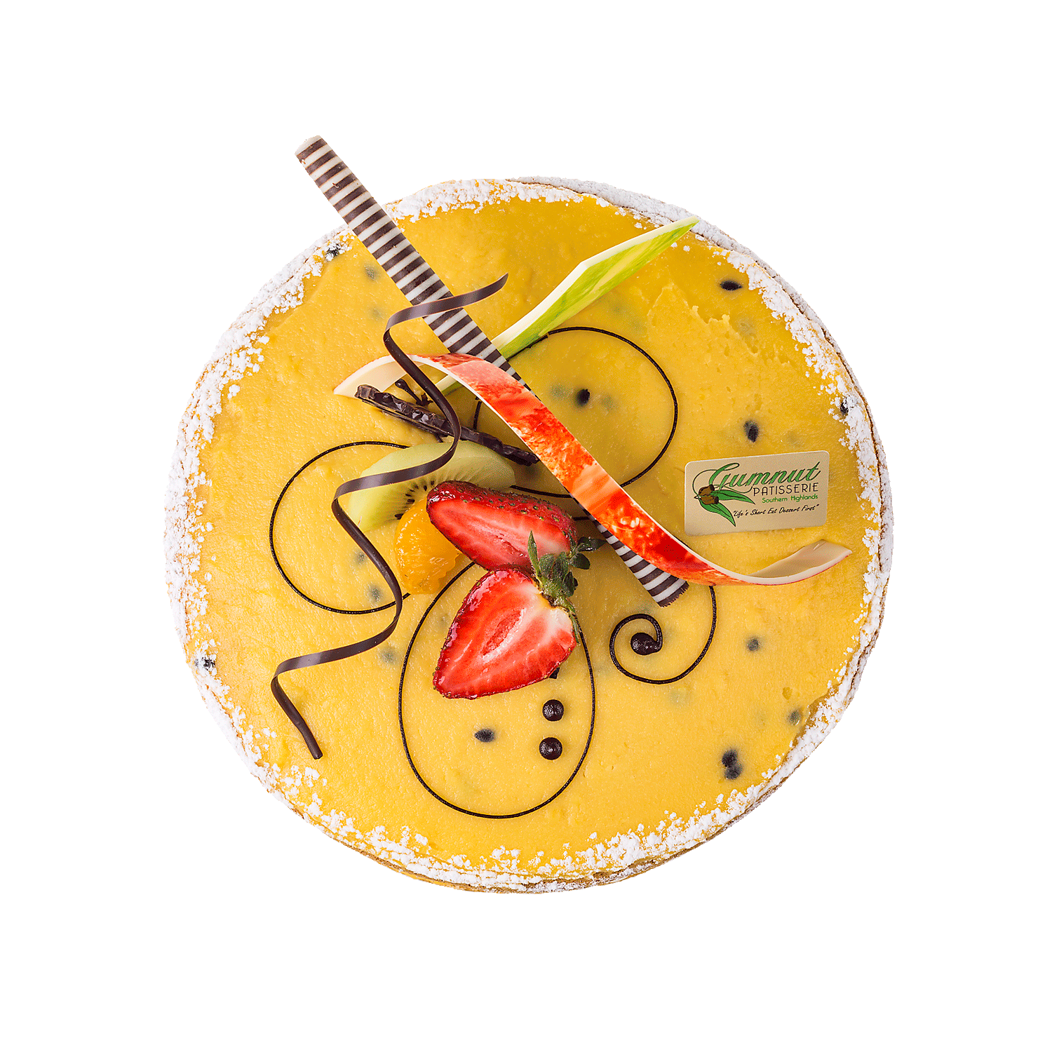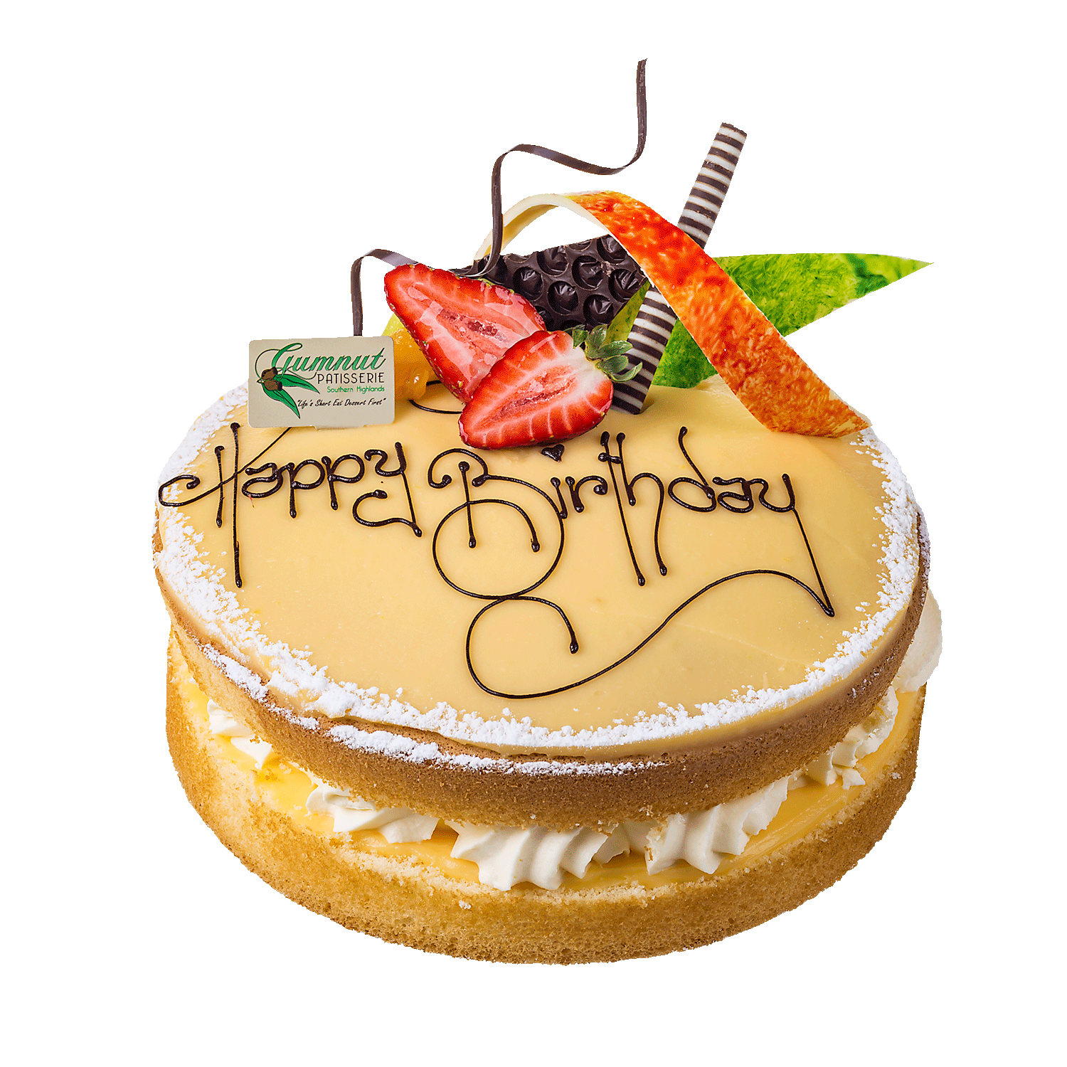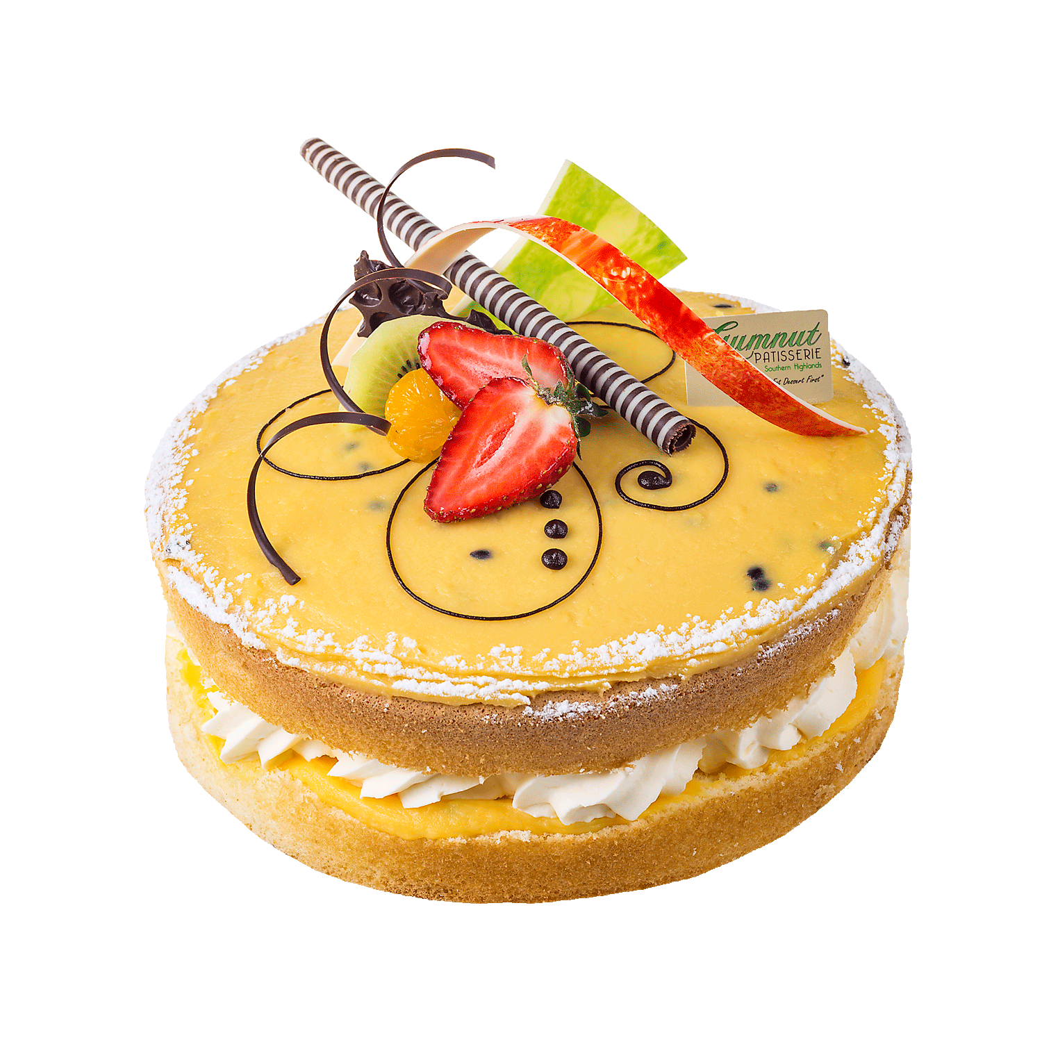 Vanilla sponge filled with a layer of Gumnut passionfruit curd & fresh cream then topped with more passionfruit curd. Finished off with a garnish of fresh fruit and our handmade chocolate dercorations.