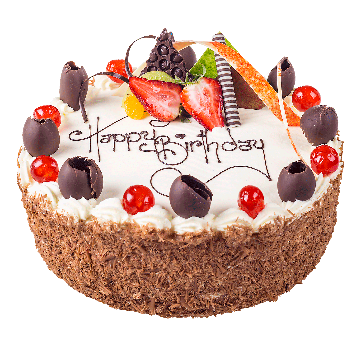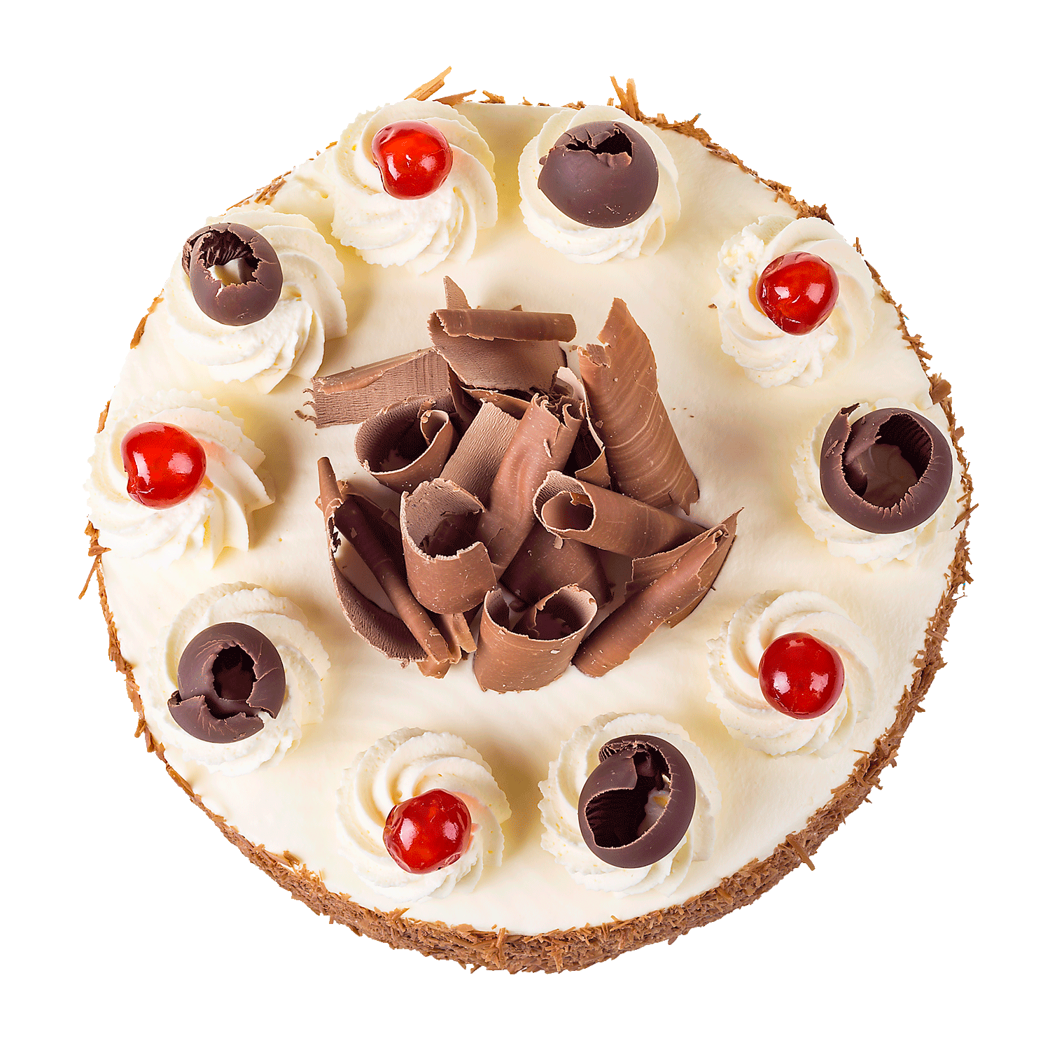 Chocolate sponge layered with fresh cream, Gumnut chocolate Crême Pâtissière sour cherries and Kirsch liqueur. Garnished with cream, handmade chocolate decorations and more cherries.
