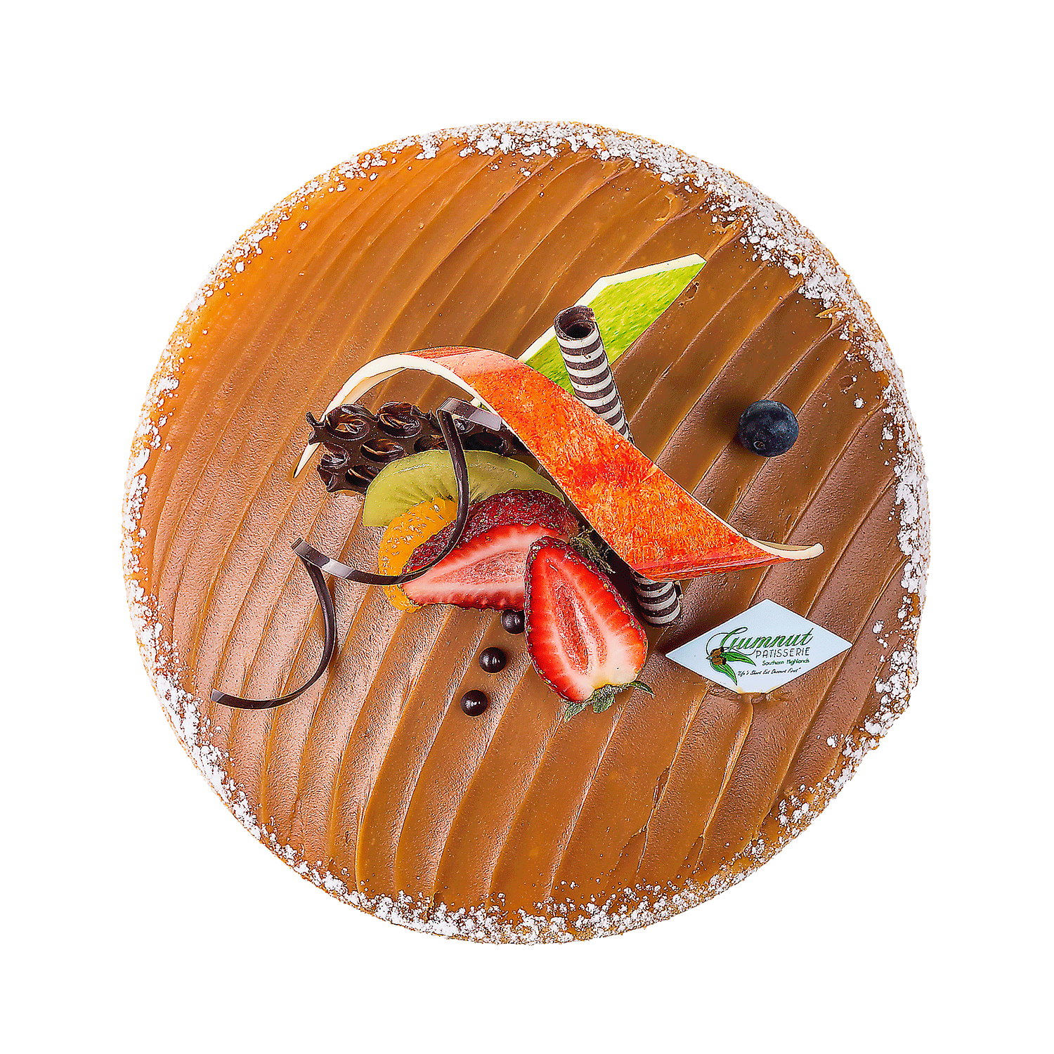 A light and fluffy Vanilla sponge filled with a layer of caramel & fresh cream then topped off with more caramel, fresh fruit and handmade chocolate decorations.