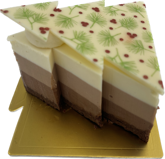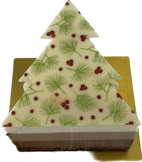 Layers of Dark, Milk and White Chocolate Mousse, in the shape of a Christmas Tree topped with unique Tree Shaped Christmas Chocolate Decoration.
