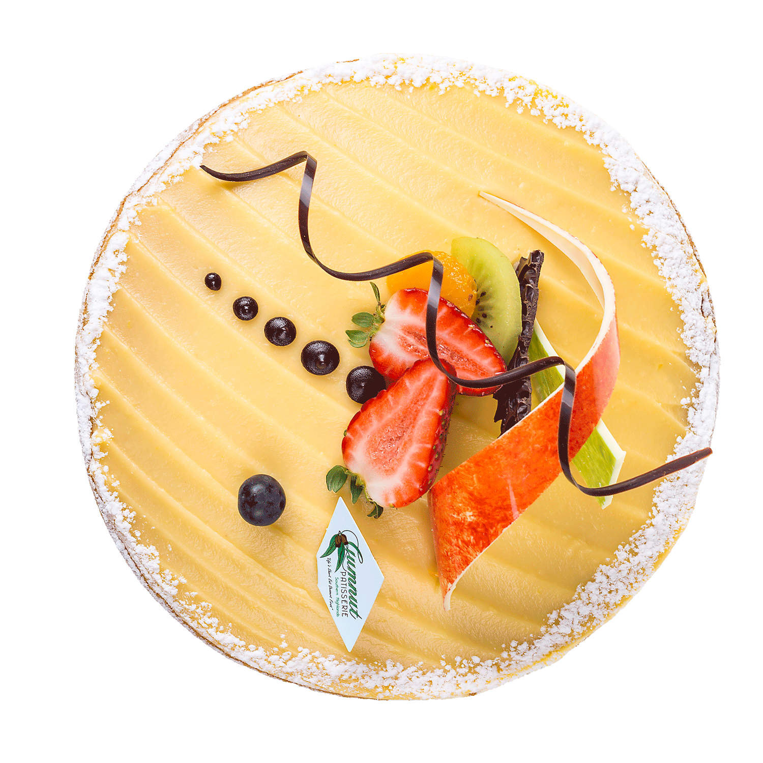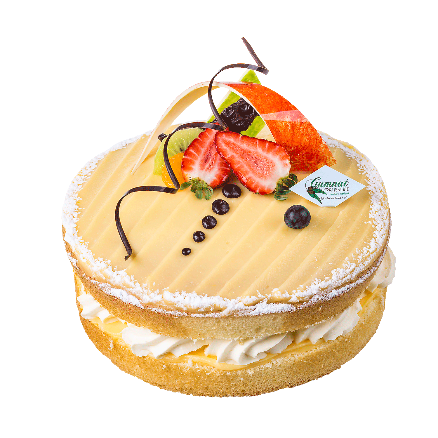 Vanilla sponge filled with a layer of our signature lemon curd & fresh cream. All this topped off with more lemon curd and garnished with fresh fruit and handmade chocolate decorations.