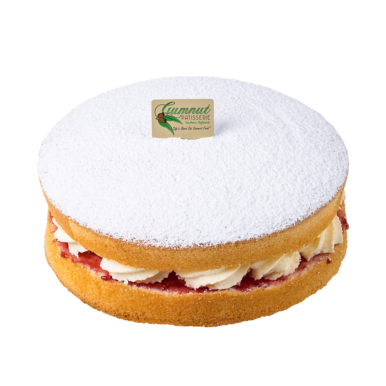 Vanilla sponge layered with Gumnut's homemade Raspberry Jam and fresh cream then dusted in icing sugar and some magic twinkle sprinkle.